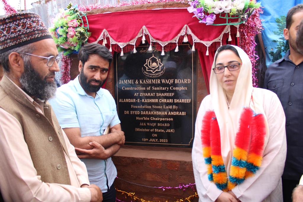 Minister of State and Chairperson J&K Waqf Board Dr Darakhshan Andrabi laid foundation stone for Utility Complex and the new Main Gate at the shrine campus of Hazrat Nooruddin Noorani (RA) at Chrar-e-Sharief during her visit today. She also issued instructions to the Engineering Wing of the Waqf Board to ensure the completion of the works before the Annual  Urs Sharief at the shrine.