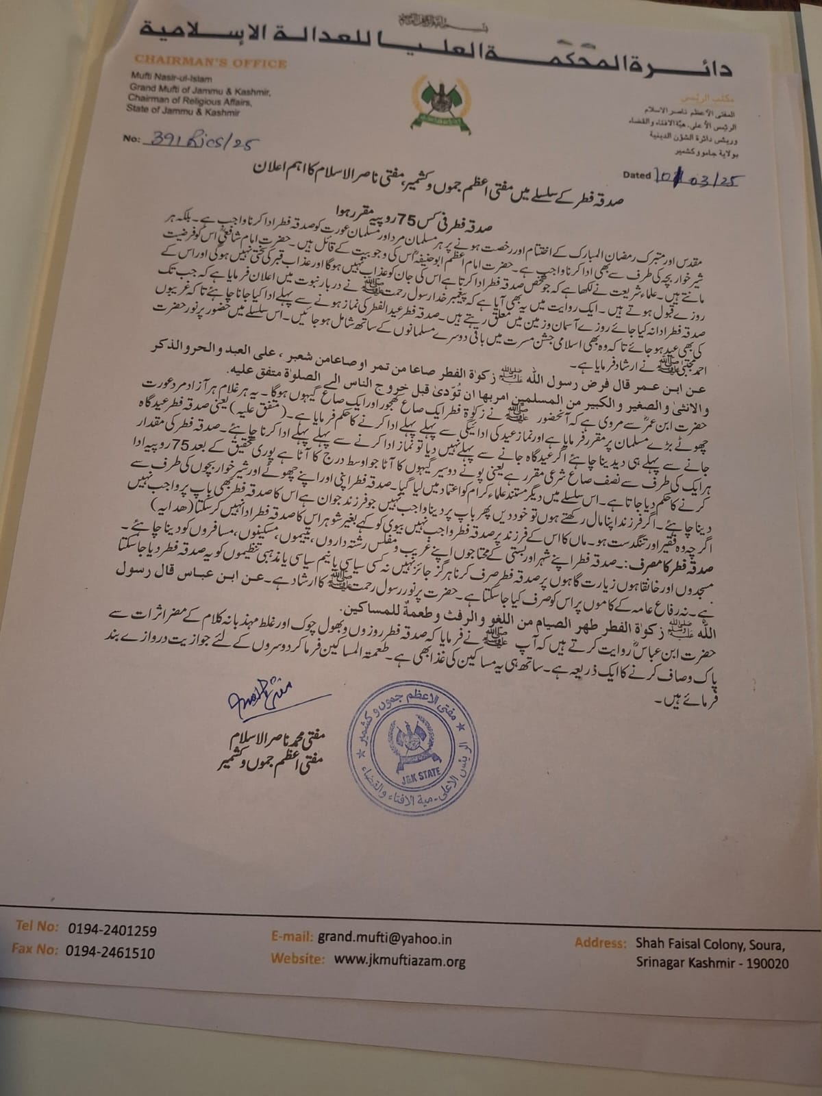 The Grand Mufti of Jammu and Kashmir has announced that the amount for (Sadqa Fitr) this year has been set at Rs. 75 per person.