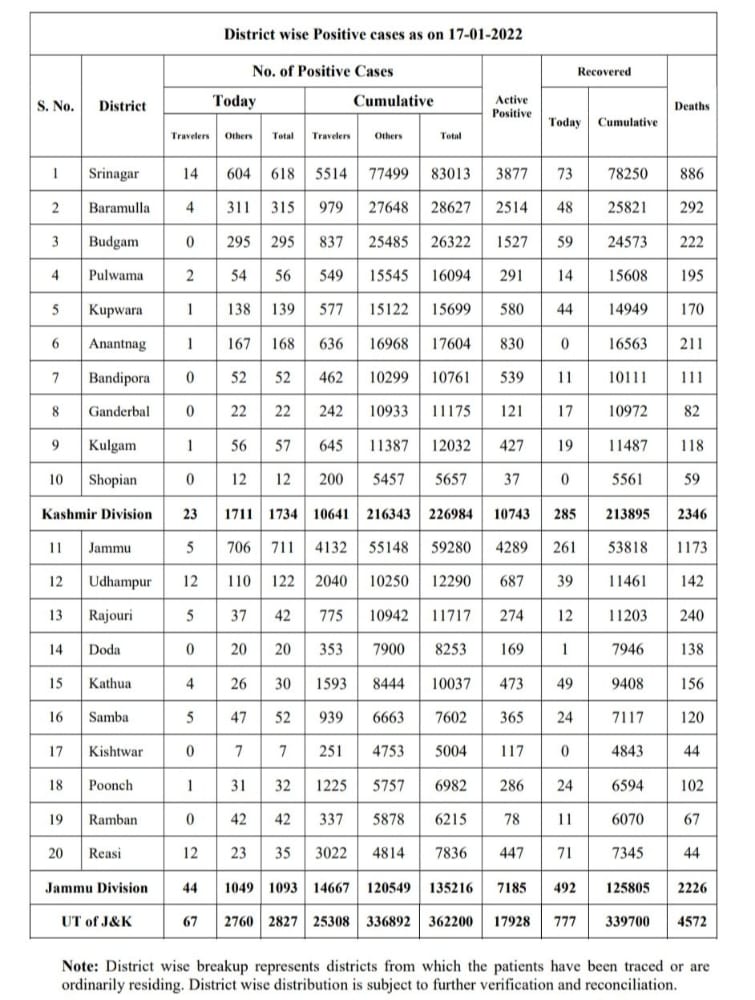 They said that 1093 of the cases were reported from Jammu Division and 1734 from Kashmir Valley, taking the overall tally to 362200.