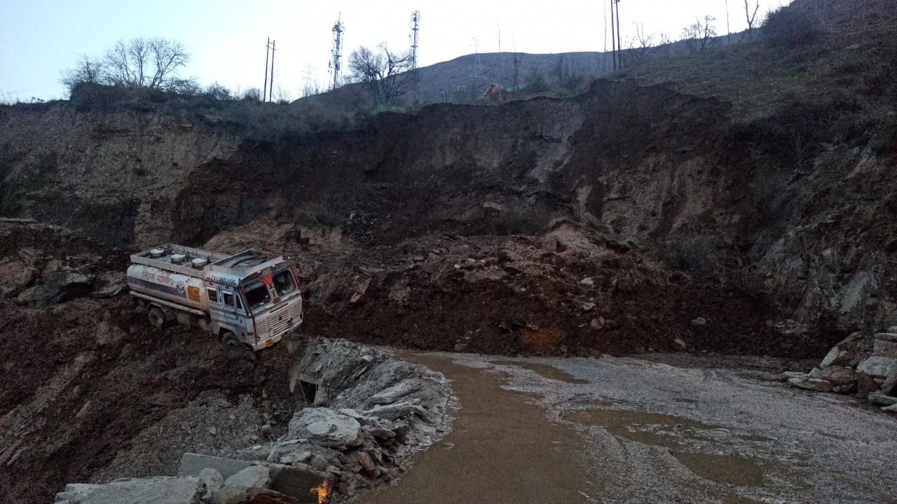 Jammu-Srinagar National Highway blocked due to a massive mudslide at Shabanbass near Banihal
