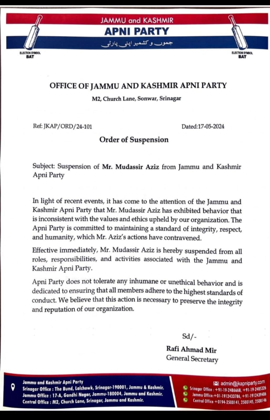 “The Apni Party is committed to maintaining a standard of integrity, respect, and humanity, which Mr. Aziz’s actions have contravened. Effective immediately, Mr. Mudassir Aziz is hereby suspended from all roles, responsibilities, and activities associated with the Jammu and Kashmir Apni Party.”