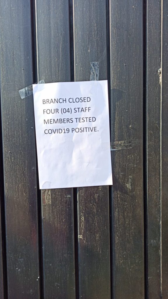 Early morning today, locals and some businessmen found board hanging on the door that 4 Employees tested positive for COVID-19 therefore branch is closed for public dealing.