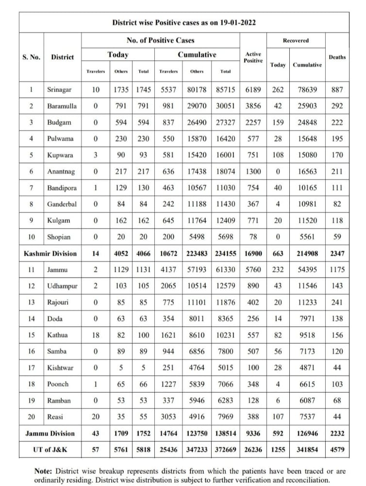 They said 1752 of the fresh cases were confirmed from Jammu Division and 4066 from Kashmir valley, taking the overall tally to 372669.