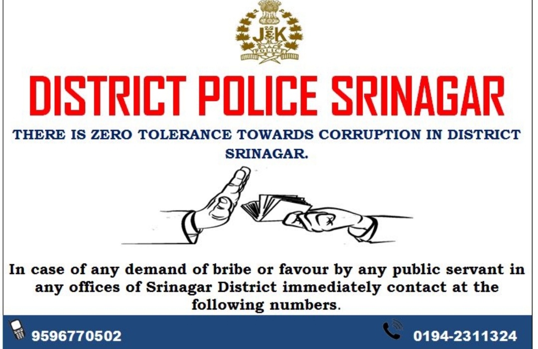 Police requests Citizens of Srinagar to report favour, bribe by any officer or employee in Srinagar